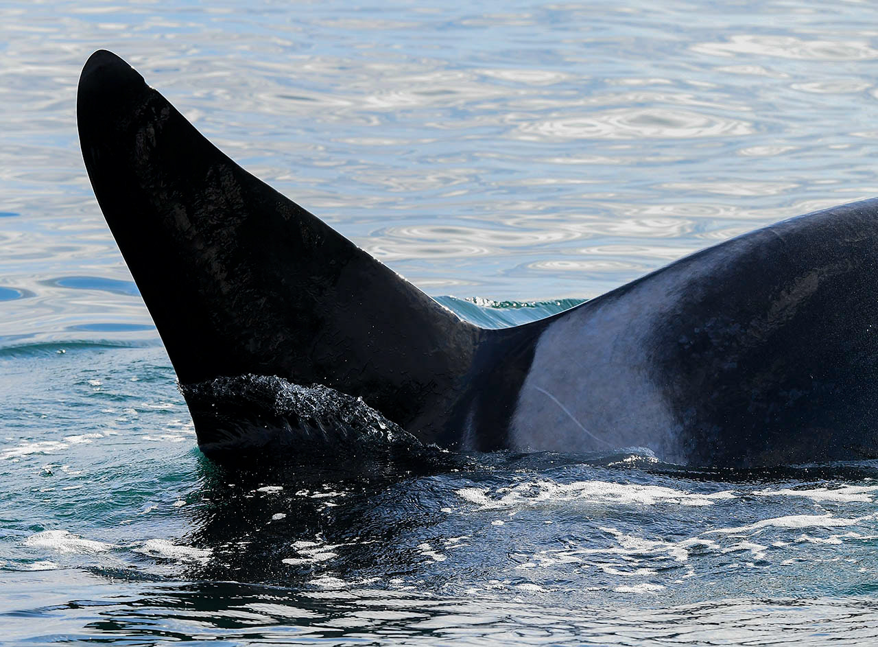 Dr. Balcomb identifies each whale by its dorsal fin and saddle patch.
